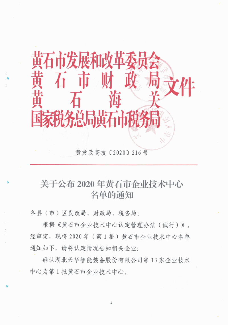 2020年(第1批)黃石市企業(yè)技術(shù)中心名單公布