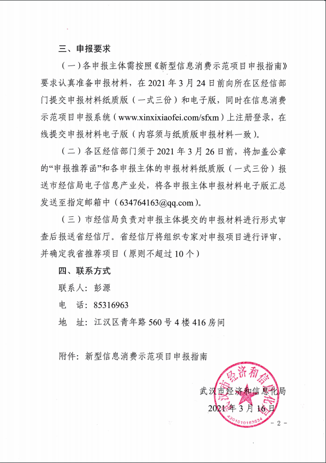 各申報企業(yè)需按照《新型信息消費示范項目申報指南》要求認(rèn)真準(zhǔn)備申報材料,在2021年3月23日17:00之前提交申報材料紙質(zhì)版(一式三份)至東湖高新區(qū)政務(wù)中心7號樓7016室和word電子版及PDF蓋章版一并打包發(fā)送至郵箱1930171438@qq.com,同時在信息消費示范項目申報系統(tǒng)(www.xinxixiaofei.com/sfxm)上注冊登錄,在線提交申報材料電子版(內(nèi)容須與紙質(zhì)版申報材料一致)。